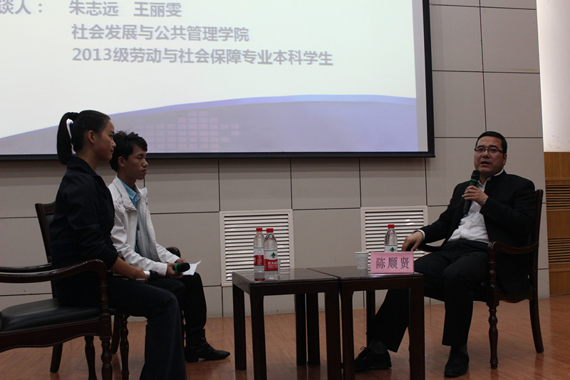 2013级劳动与社会保障专业本科学生王丽雯、朱志远就自我创业的话题对陈顺贤董事长进行了职业人物生涯访谈。在访谈过程中,陈顺贤董事长就同学们提出的问题,结合自身的真实经历,为大家讲解了他对创业若干问题的理解和认识,加深了在场师生对自我创业这个就业途径的认识。讲座正式开始后,陈顺贤董事长以“创业者的八大修炼”为主题,从“敢”、“状态”、“相信自我”、“有强烈的企图心”、“专业”、“学习”、“珍惜时间”、“观念”等八个方面,详细讲解了创业者应具备的基本素质。在讲座中,陈顺贤董事长富有激情、幽默风趣、紧密联系生活的讲解,赢得了a动漫