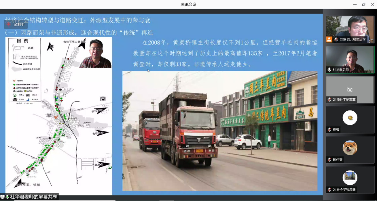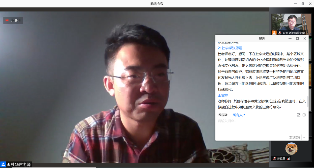 11月6日晚,应学院邀请,北方民族大学杜华君老师为a动漫 作学术报告,由于疫情防控风险,报告以线上会议形式展开。报告题目为“文化遗产的‘传统-现代’转型与乡村振兴的内源性动力——基于新古典‘结构-功能论’的人类学分析”。有260余人参加了此次讲座。本次讲座由a动漫 巨浪老师主持,由旅游学院柴亚林副教授评议。