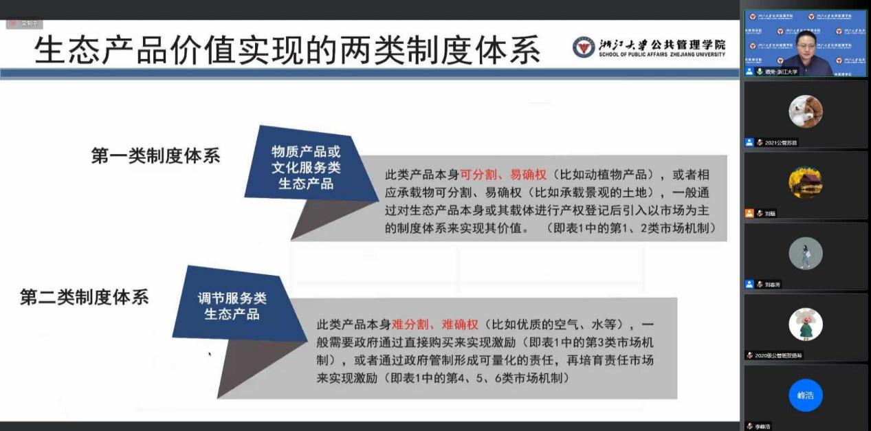 再次,谭荣教授从党的十九大以来,在“绿水青山就是金山银山”理念的背景下,介绍了农村的土地资产和市场化的现象。谭教授指出,在整体宏观地总结不同地方的案例的过程中发现,十九大报告着重于“生态产品”一词,并开始关注生态产品价值实现的问题,积极推广“绿水青山就是金山银山”的价值路径。其中谭教授提到,生态产品分为三类:第一类是物质型的生态产品,看得见摸得着,在很好的生态环境和生态条件下生产出来的农产品、工业产品等,且有生态品牌、能在市场上交易的产品;第二类生态产品是看不见摸不着,具有生态涵养的功能,具有外部性的特征,面临着如何进行市场化的管理;第三类是类似于具有历史文化传承价值的产品,在现实中可以依托于类似土地这样的载体,这部分生态产品也可以进行分割和衡量。通过对实践和文献的观察和梳理之后,展现了两种生态产品价值实现的两种制度体系:针对物质产品和文化的服务类生态产品;针对调节服务类的市场产品。同时谭教授也讲述了两类制度体系的特征以及政府、政府间市场和个体间市场需要采取的措施。