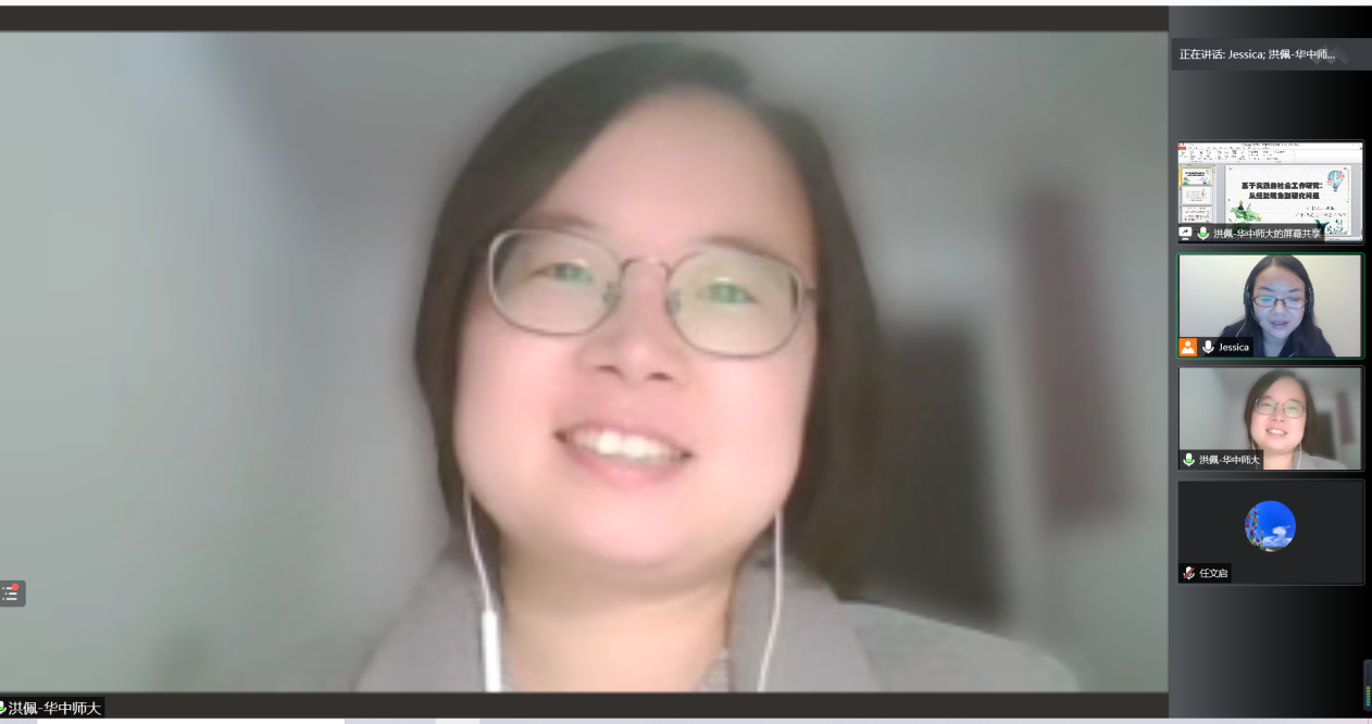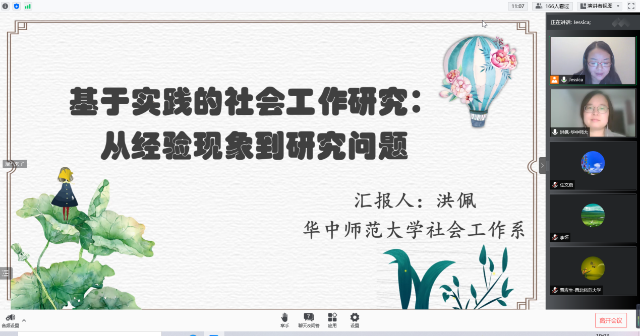 秋冬之际,我们相聚“云端”,共享学术盛宴。11月14日晚,华中师范大学洪佩博士应邀为a动漫 师生作题为“基于实践的社会工作研究:从经验现象到研究问题”的学术报告。本次报告由赵茜老师主持,甘肃政法大学任文启教授评议,近500名校内外师生参加了本次讲座。