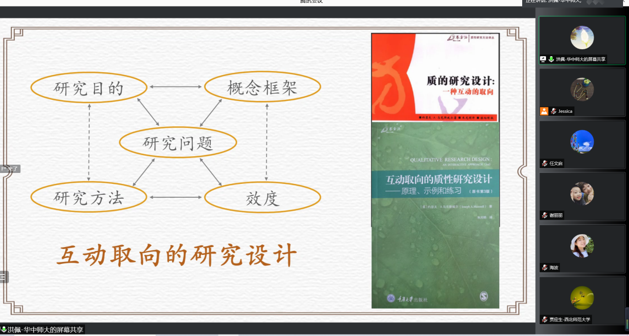 洪老师以一个标准的学术研究过程框架开启报告,向我们介绍了从日常关注的经验现象出发到提出一个好的研究问题的过程。洪老师指出,“研究问题”的确定是一个由研究领域到研究主题再到研究问题逐步聚焦的思维过程,互动取向的研究设计需要有明确的研究目的、清晰的概念框架、合理的研究问题、合适的研究方法和精准的效度做支撑。