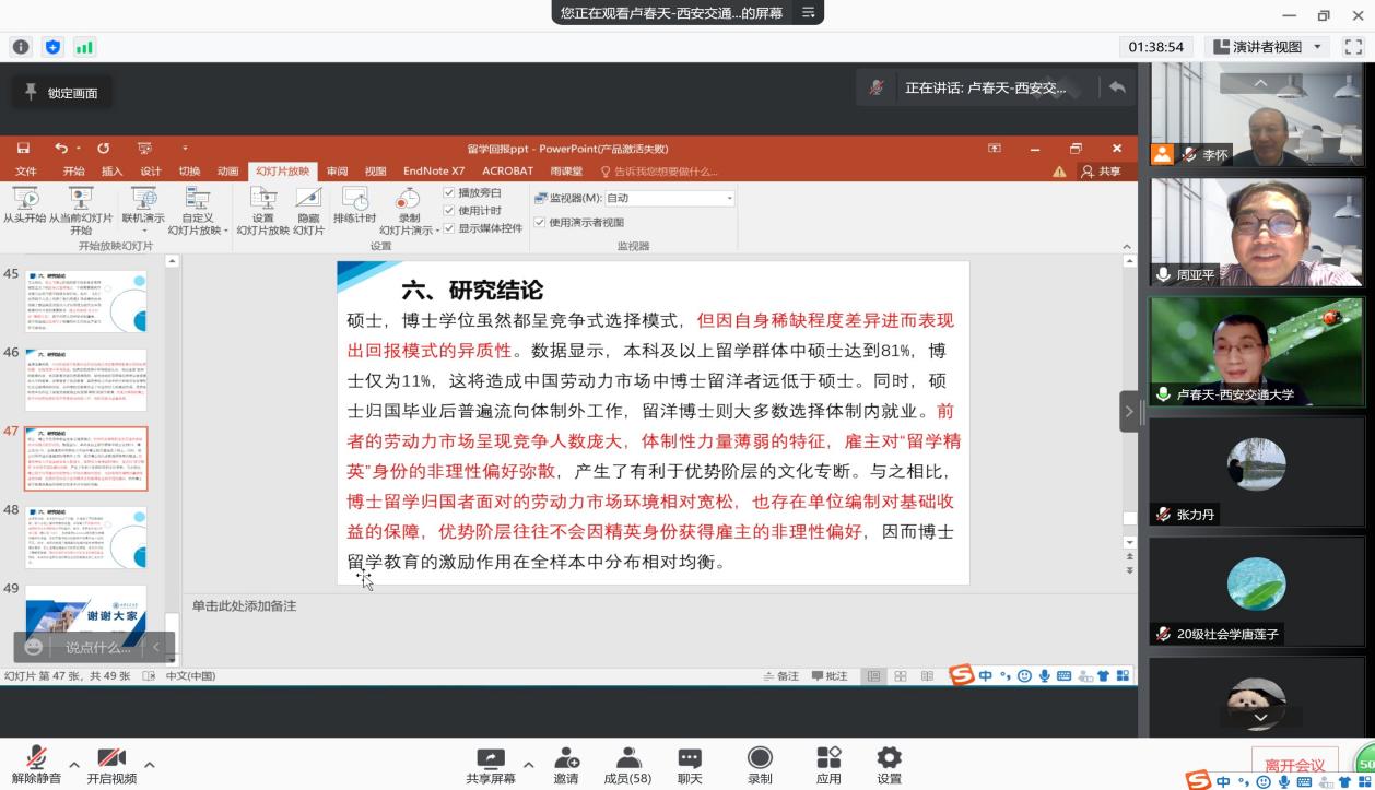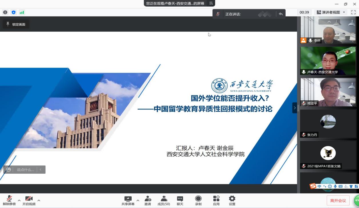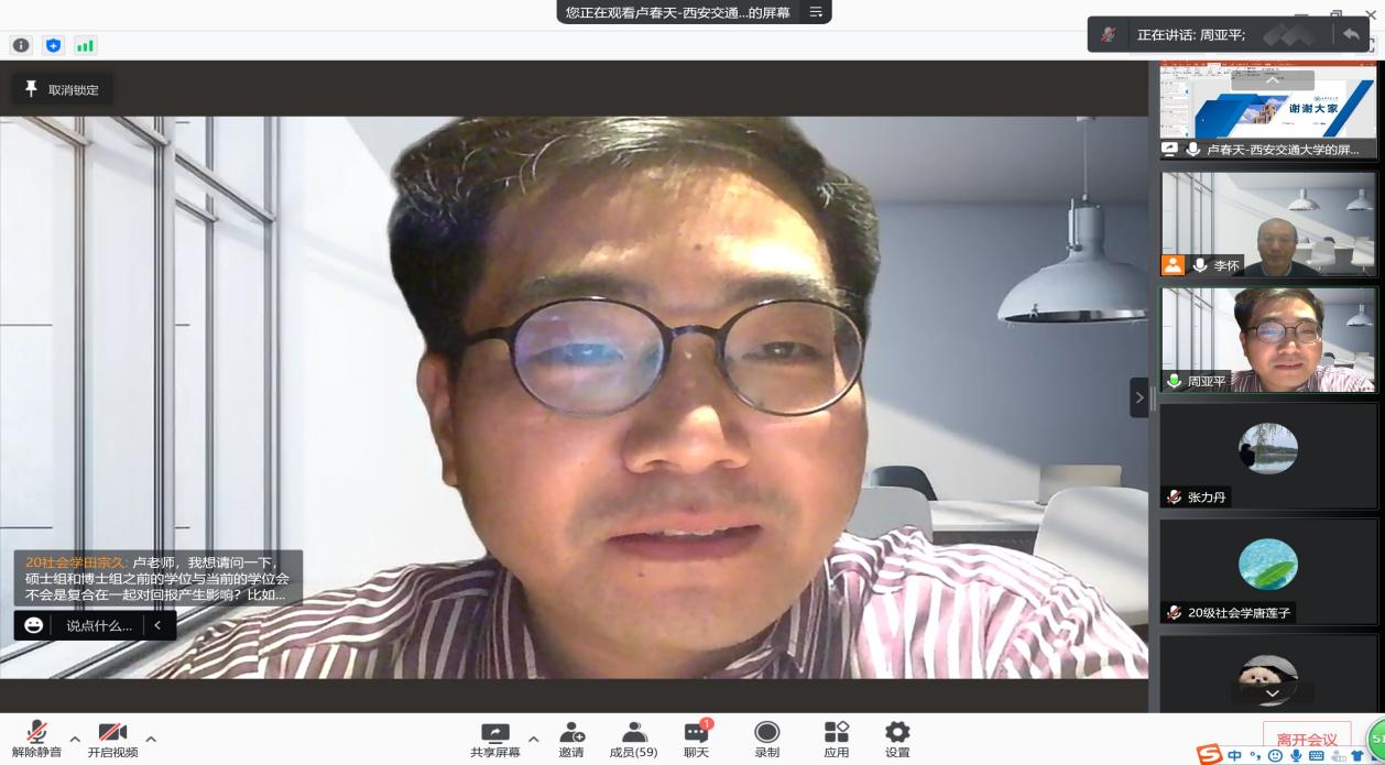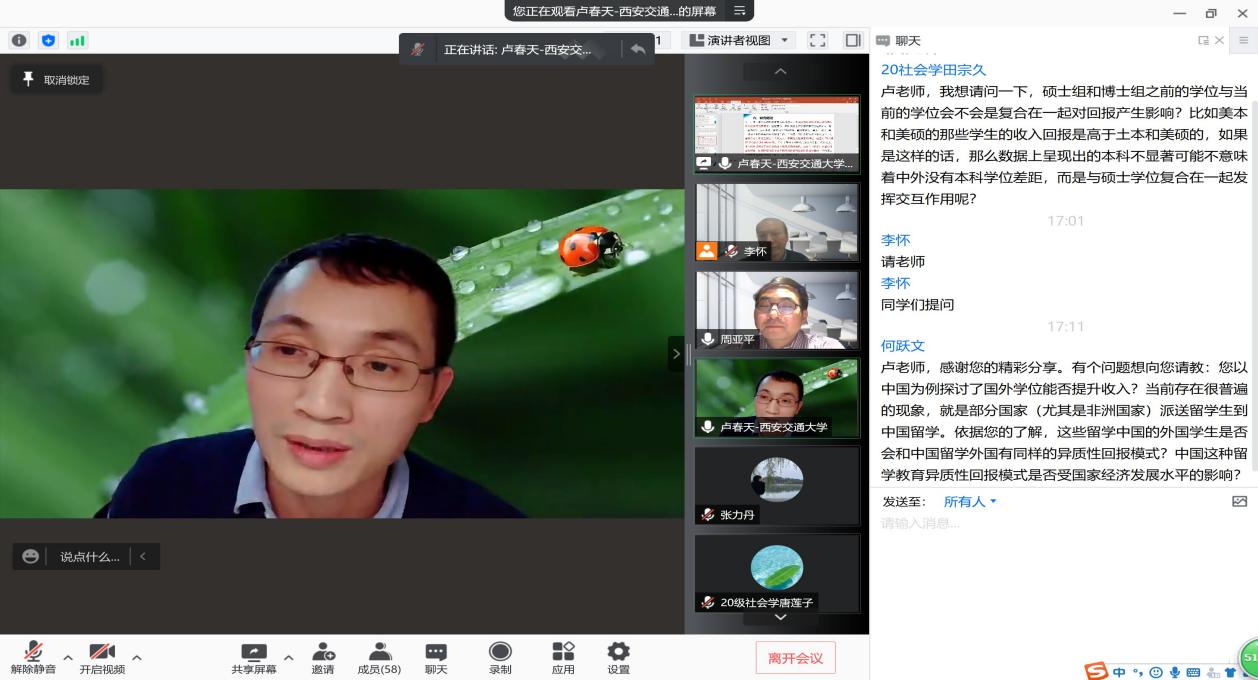 2021年12月2日下午,应a动漫 邀请,西安交通大学社会学系教授卢春天在腾讯会议上为a动漫 师生带来一场名为“国外学位能否提升收入?——中国留学教育异质性回报模式的探讨”的学术讲座。社会发展与公共管理学院部分研究生在线参加。本次讲座由李怀教授担任主持人,兰州大学周亚平教授担任与谈人。