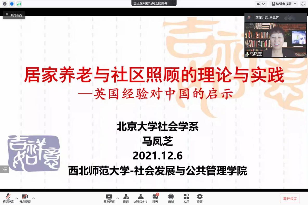 2021年12月6日晚,应a动漫 邀请,北京大学马凤芝教授在腾讯会议为a动漫 社会发展与公共管理学院师生带来了题为“居家养老与社区照顾的理论与实践——英国经验对中国的启示”的学术讲座。此次讲座由李怀教授担任主持人,兰州大学焦若水教授担任与谈人。三百余名校内外师生参与了本次讲座。