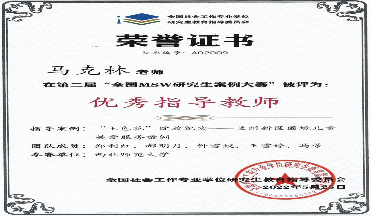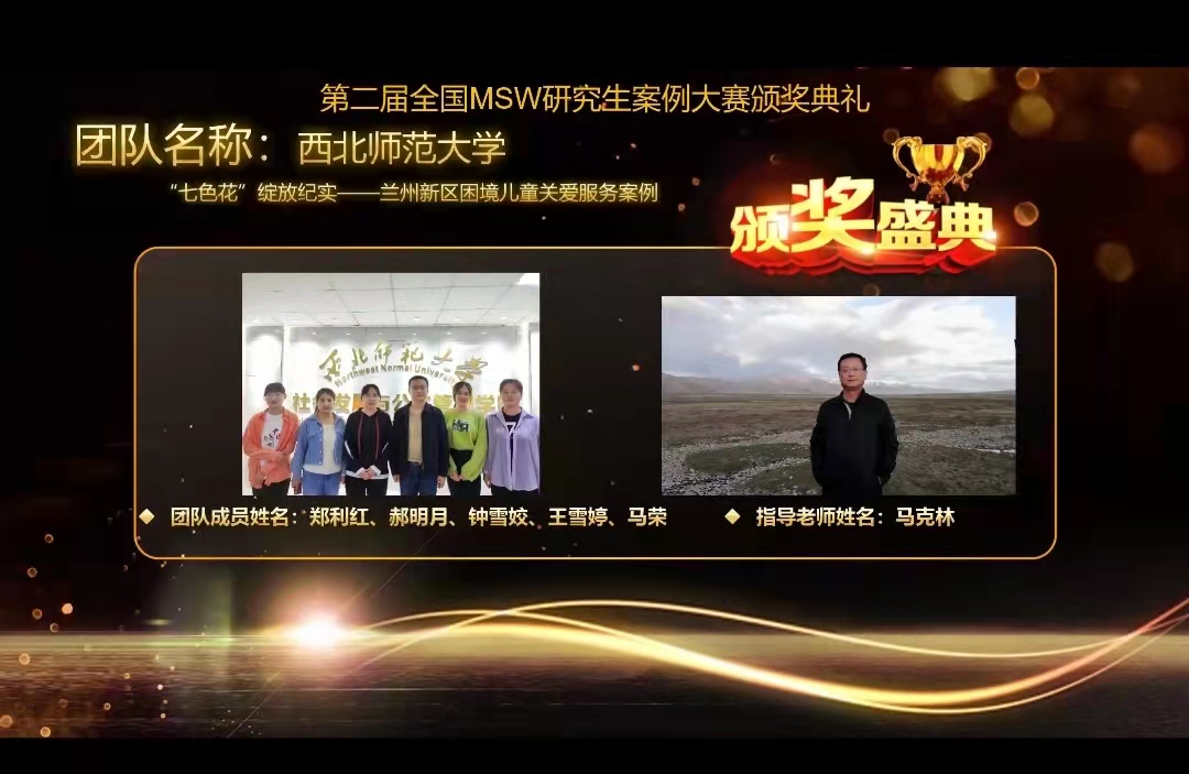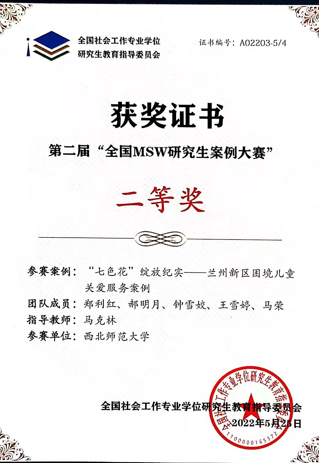 决赛于2022年5月15日举办,采用线上评审和答辩的方式,通过线上直播。决赛全程采取参赛选手与评委“双向匿名”的模式,评选出特等奖、一等奖、二等奖。由a动漫 马克林教授指导,2021级MSW研究生郑利红(团队负责人)、郝明月、钟雪娇、王雪婷、马荣组队申报的《“七色花绽放纪实”——兰州新区困境儿童关爱服务案例》荣获大赛二等奖。马克林教授被评为第二届“全国MSW研究生案例大赛”优秀指导教师。
