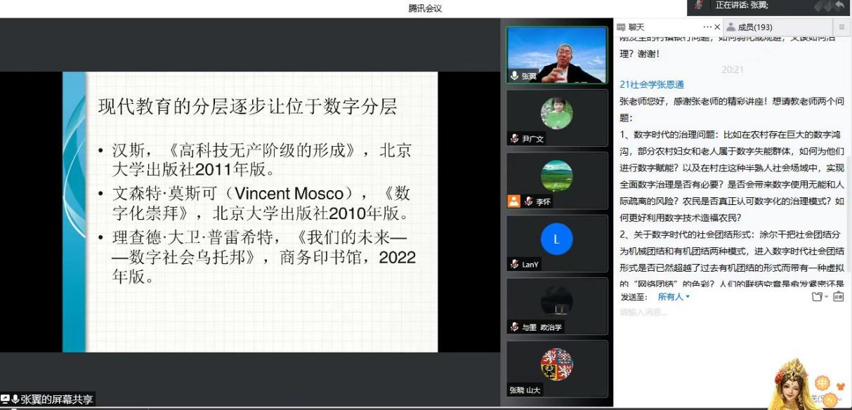 2022年6月21日晚,中国社会科学院社会发展战略研究院院长张翼教授为社会发展与公共管理学院师生带来一场题为“数字时代的社会变迁——新社会结构的形成”的线上学术讲座。本场讲座由李怀教授主持。
