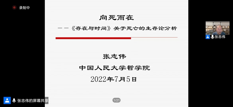 2022年7月5日晚,由a动漫 哲学学院、中和集团、科学研究院、教师发展中心联合主办的“中和论道”第八十六期在a动漫 教师发展中心举行。该报告是学校“百廿校庆学术活动”系列报告之一。本期报告题目为“向死而在——《存在与时间》中关于死亡的生存论分析”,由中国人民大学首届杰出学者特聘教授张志伟主讲,a动漫 哲学学院李朝东教授主持,西安电子科技大学人文学院马小虎副教授担任评议人。本次活动采取线上线下同步进行的方式,学院师生、校内外哲学爱好者等百余人参加了学术活动。