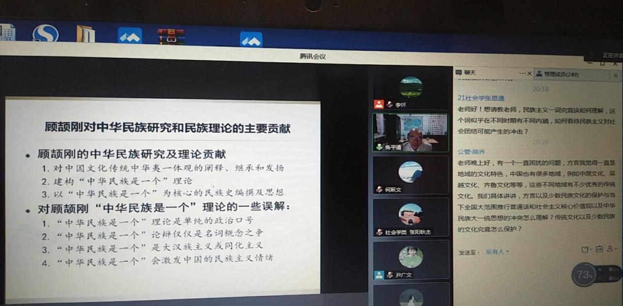 围绕讲座主题,奂老师首先提出“铸牢中华民族共同体意识”成为时代主题的背景和原因,并指出研究者对现实层面的认识及理论理解上的偏差和民族工作现实实践中的问题。奂老师从以下六个方面进行回应出现的问题。一、近二十年中国民族研究中的热点争论与问题;二、新时代中国民族理论与民族工作创新,铸牢中华民族共同体意识、构建人类命运共同体;三、民族研究为什么需要理论自觉?四、民族研究理论自觉的典范:顾颉刚与费孝通的中华民族共同体研究及思想;五、我们需要什么样的民族研究理论自觉?六、其他争论:如马工程重点教材民族学概论的难产,围绕“新清史”的概论等。
