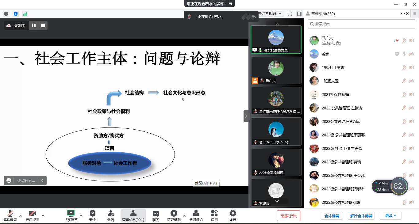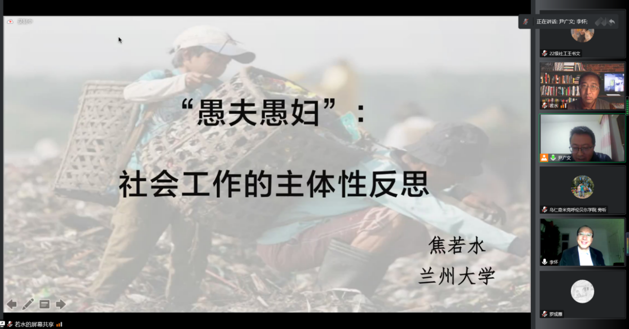 2022年10月19日19时,百廿校庆暨十年院庆校友论坛系列学术讲座第四场,由兰州大学焦若水教授开讲。焦老师为a动漫 师生作题为“‘愚夫愚妇’:社会工作的主体性反思”的学术讲座。本次讲座由尹广文副教授主持,甘肃政法大学公共管理学院任文启教授作评议人,近三百名师生参加。