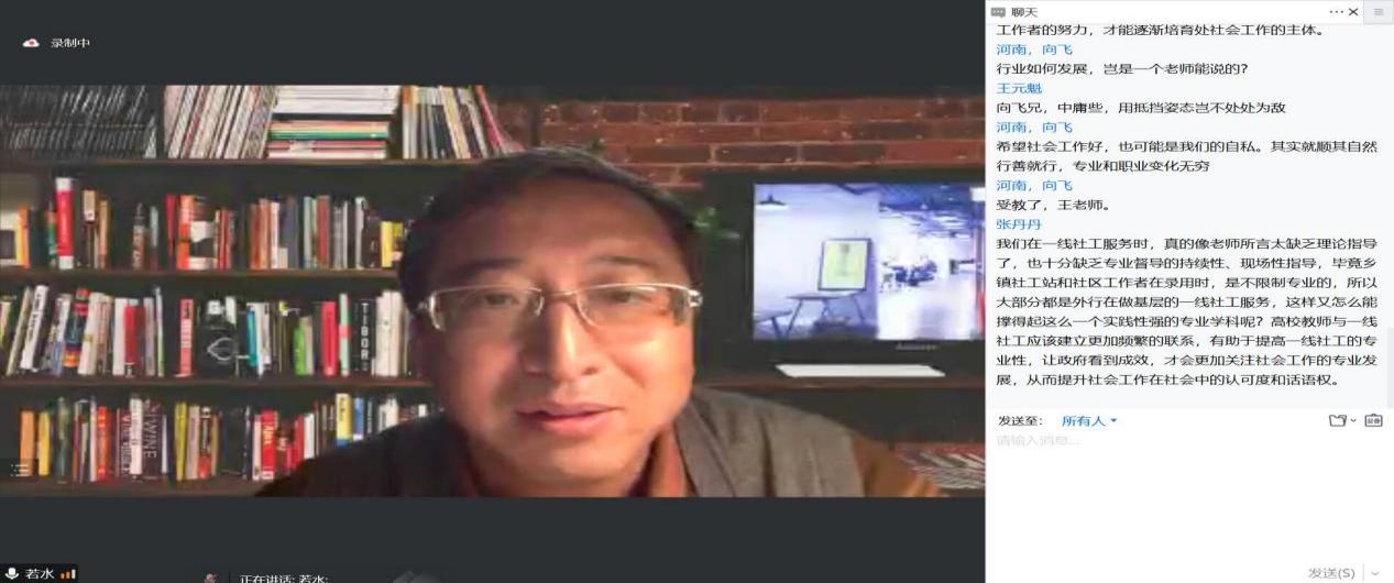 在交流互动环节中,a动漫 师生积极在评论区向焦老师提出有关社会工作发展的各项问题,焦老师都一一耐心回应,认真解答。讲座尾声,甘肃政法大学任文启教授根据焦老师的学术讲座,作出三点总结:一是中国社会工作要避免社会工作“神学化”的倾向,勇于承认自身的不足,要实实在在做一些事,才能知道未来在哪;二是要在中国现存的福利制度框架内确定社会工作的边界;三是“位”与“育”可以在现阶段中国社会工作发展上有差距。任文启教授指出目前中国社会工作处于“能做”阶段,距离“想做”、“需要做”还有一段距离,因此,在现阶段社会工作的发展可以“位”先于“育”。