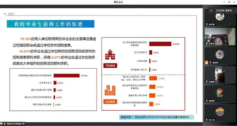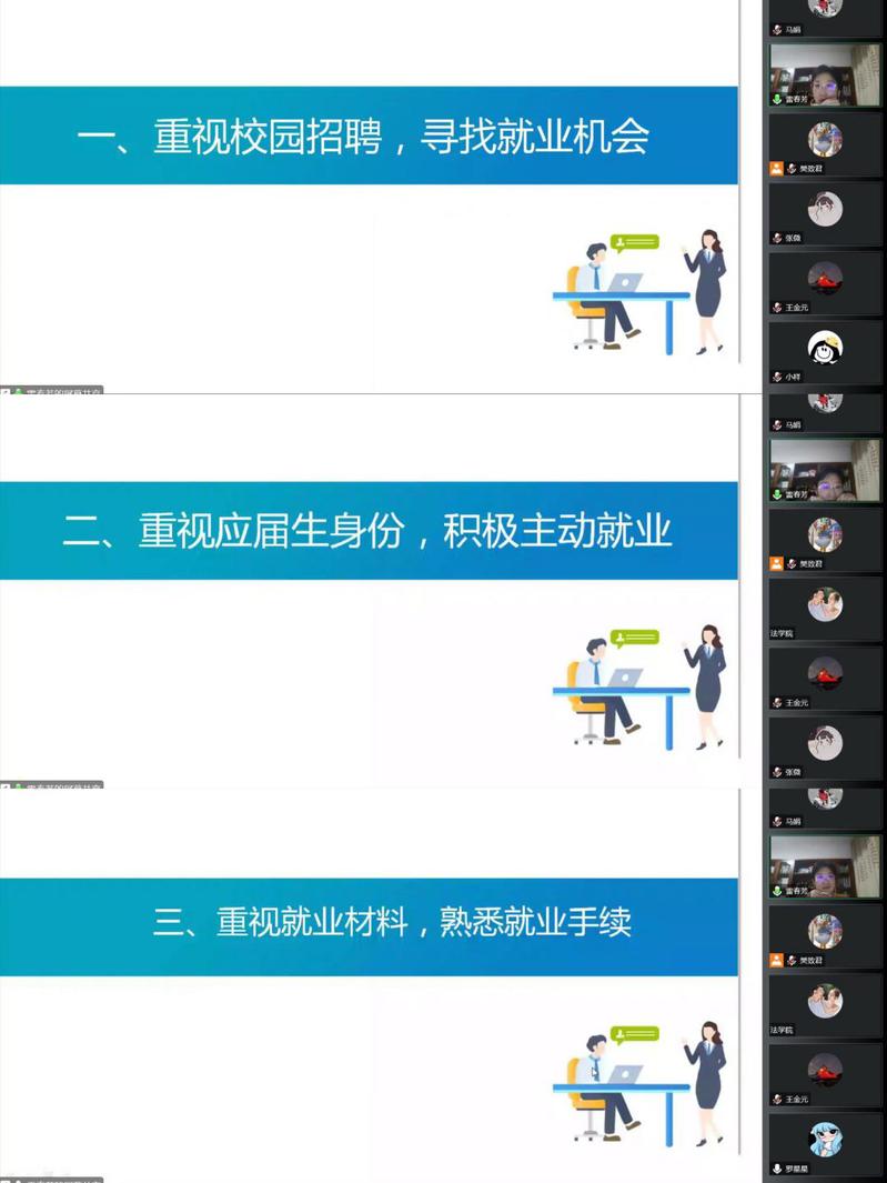 10月31日晚,哲学学院与法学院联合举办了以“疫情常态化下,‘三个重视’助力顺利求职”为主题的线上就业指导专题讲座,由a动漫 招生就业处就业指导教师、GCDF全球职业规划师、高级就业指导师雷春芳老师主讲,学院全体2023届毕业生、领导班子、研究生导师、负责就业工作的辅导员参会。
