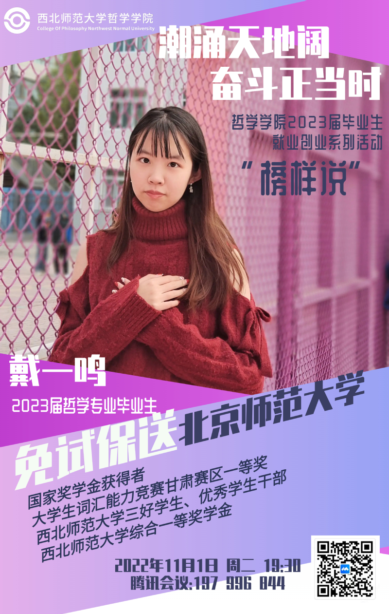 戴一鸣从学业成绩的积累、推免的要求和流程等方面展开分享,结合自身在不同科目学习上的优势和丰富的实践经历为学弟学妹们梳理了自己大学四年的成长历程。对于即将结束的大学生活,她说:“师大求学的日子如冬夜微火,冰雪消融,枯木新芽。老师带领我们回首历史的长河,仰望头顶的星空,追寻哲学家们捍卫人自由和尊严的身影,来到明亮的殿堂学习和实践,培养批判思维,体悟宏大关怀,在二难困境中严肃求索,在天地人伦中积极生长,之后生命的每一天都将掷地有声。”