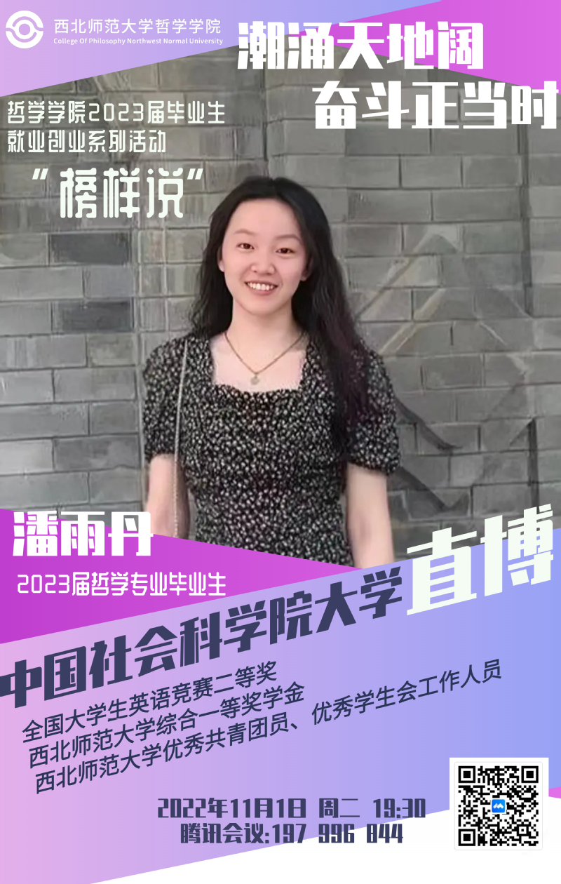 潘雨丹结合日常学习、学生工作、科研竞赛等方面遇到的问题详细地跟学弟学妹梳理了自己在学习、生活方面总结出来的好习惯。对于即将结束的大学生活,她说:“哲学学院见证了我们的成长,在这里,老师带我们领略不同哲学家的风采,带我们揭开看似深奥的思想背后的神秘面纱。在这里,我们为了惊奇而求知,为了求知而求知。在一步步检验疑团的过程中,我们收获的不止有精神上的充实,更有对自身价值的深刻认识。”