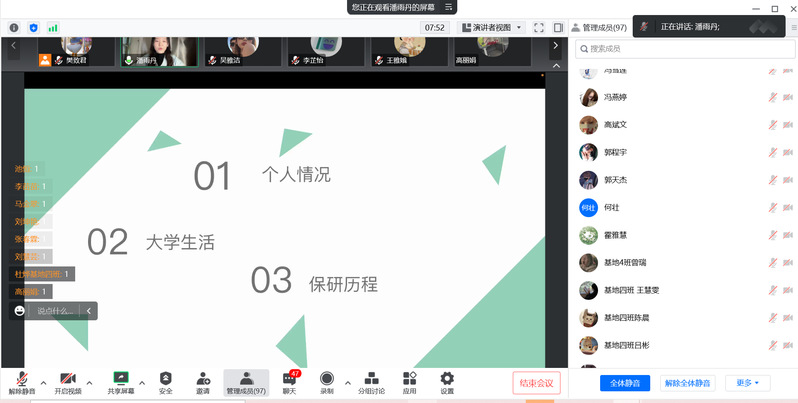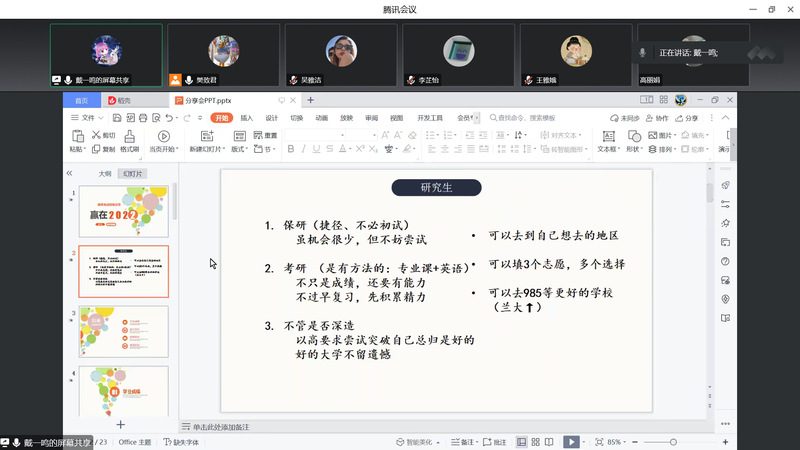 11月1日晚,学院通过腾讯会议线上举办了2023届毕业生就业指导活动——“榜样说”专题分享会,邀请2023届研究生推免资格获得者潘雨丹、戴一鸣两位同学做分享,由学院专职辅导员樊致君主持,2020级、2021级和2022级全体本科生参会。
