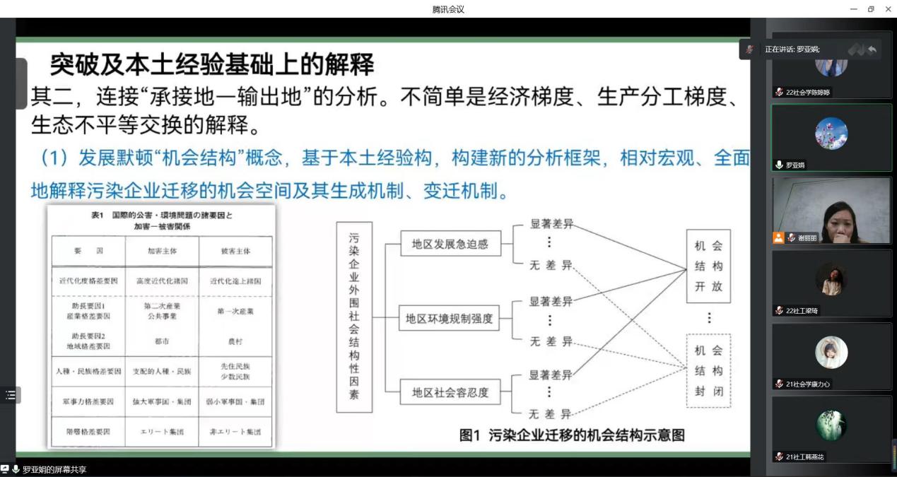 本次讲座罗老师主要针对污染企业迁移问题从社会学角度进行阐释,给我们展示了一个崭新的研究视角。讲座从三个方面展开:第一,罗老师通过展示企业污染的现场图,比如2011年“万人大逃亡”事件;2019年3.12大爆炸事件;常州外国语学校搬到新校区因环境污染学生出现的各种不适症;江苏滨海再现铅污染阴影造成多名孩子中毒事件等。给我们生动形象地展示了由于污染企业迁移导致频发的社会问题和经济损失。