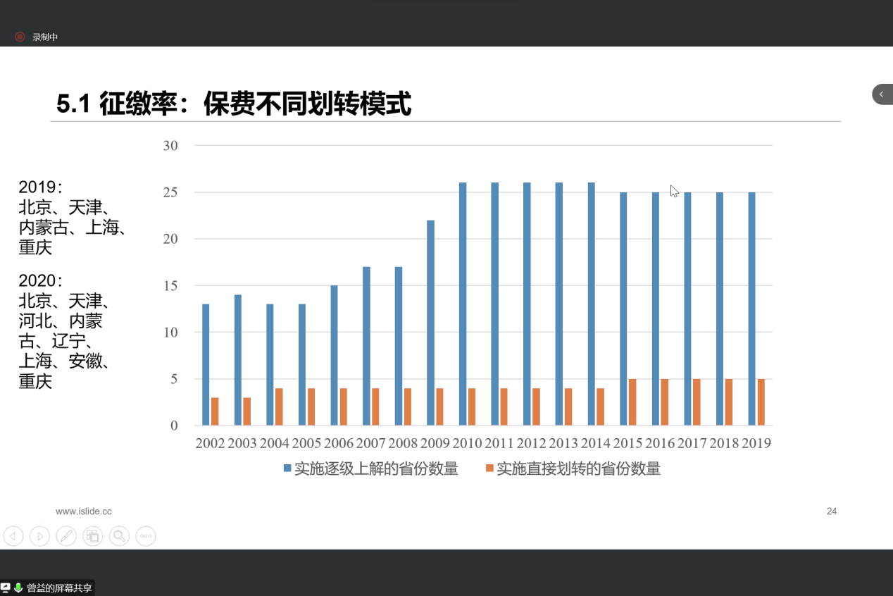 在第四部分的模型构建中,曾老师详细介绍了四个模型,分别是基金收入模型、基金支出模型、基金累计结余模型和财政补贴模型。模型构建后接着就是第五部分的参数设定,曾老师就保费逐级上解的“L模式”和保费直接划转的“7模式”分别设置参数带入计量模型进行计算得出统计结果。第六部分的实证结果表明:“逐级上解”短期内能够减少财政补贴规模,但是长期来看,两者财政补贴规模基本持平;“保费直接划转”模式由于地方政府保费征收积极性的降低,征缴率下降,从而使得财政补贴不降反升。对此,曾老师进一步引入延迟退休年龄政策来缓解财政压力,并且进行了稳健性检验和敏感性测试。第七部分得出结论:“逐级上解”模式的财政压力低于“直接划转”模式,但考虑到“逐级上解”模式的资金到位率低于“直接划转”模式,且当引入延迟退休等政策干预时,“直接划转”模式的财政压力低于未实现全国统筹的情况。因此,在推进养老保险全国统筹的进程中,应优先选择“直接划转”模式,并建立激励机制提高地方政府保费征缴积极性。随后,曾老师根据结论提出相应的政策建议,并且进一步引入相关的计量模型分析得出:经办服务体系应当选择垂直管理体系而非属地管理体系。