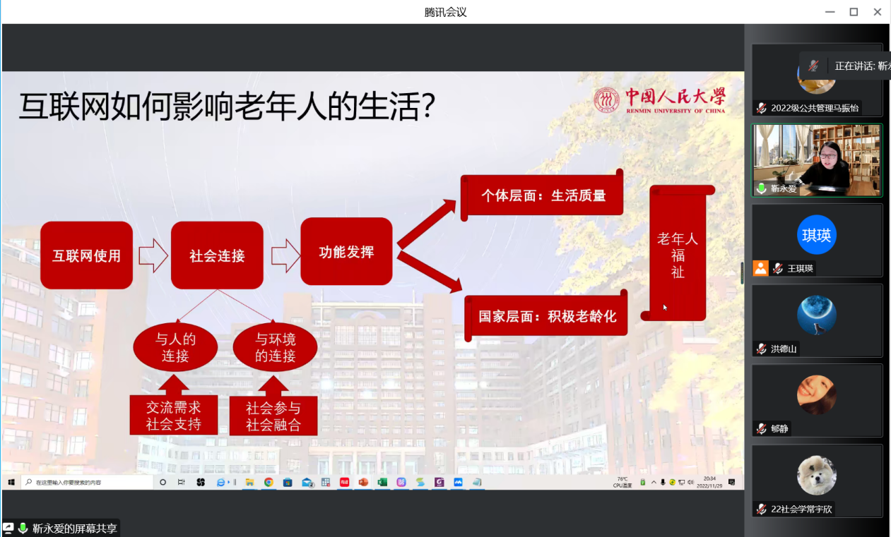 其次,靳老师着重讲述了研究问题。主要有四个方面:一、互联网使用会对老年人产生影响吗?二、不同强度的互联网使用会产生什么影响?三、不同类型的互联网使用会产生什么影响?四、互联网产生影响的机制是什么?研究数据采用的是中国人民大学人口与发展中心2022年&2021年的调查、中国老年社会追踪调查(CLASS)。靳老师首先提出在积极老龄化和健康老龄化的研究框架下,提炼出了具体指标,然后利用量化研究方法进行了深入分析与研究。通过对不同变量的分析,说明使用互联网和不使用互联网的老年人的差别,有地域、学历、社会地位、意愿等的影响。接着靳老师从三个方面进行了详细的阐述:从老年人的互联网生活方面来看,互联网对老年人的用途主要体现在使用微信、QQ、看电视、电影和其他社交软件等进行文字、视频聊天和社交活动。上网的时间主要用在了社交聊天、学习、娱乐上,每天平均时间在4个小时左右。从老年人互联网使用与线下活动参与情况来看,由于近几年社会环境的变化,使得人们生活方式有了很大改变,智能手机使用时间与个体性线下活动参与的时间基本相等。从老年人互联网使用与社会适应来看,靳老师指出就整体而言,使用互联网年限较长的老年人为社会贡献的意愿、自我价值的感知、学习的意愿更强。然后,靳老师利用大量的老年人的短视频生活,来分析老年人对互联网的使用行为及效果。主要体现在影视、时事新闻类、美食类、亲朋好友的动态类、日常生活类、生活小技巧类、轻松搞笑类。结合短视频的使用强度,得出互联网对老年人是有积极影响的,使得家人朋友关系更加密切,结交新朋友的机会变多,生活更加丰富,视野更加开阔。另外,靳老师指出利用类型互联网的影响主要是:家庭网络规模的扩大有助于降低老年人的孤独感,促进个体交流的互联网工具可以通过扩大家庭网络帮助老年人降低孤独感,纯信息获取性质的互联网工具反而对家庭网络具有负面作用。接着靳老师提出可以将访谈资料整理分类进而形成互联网产生影响的机制,来判断互联网如何影响老年人生活,从衣食住行、学习资源的利用、社交需求到体现信息传播功能,都可以慢慢实现。