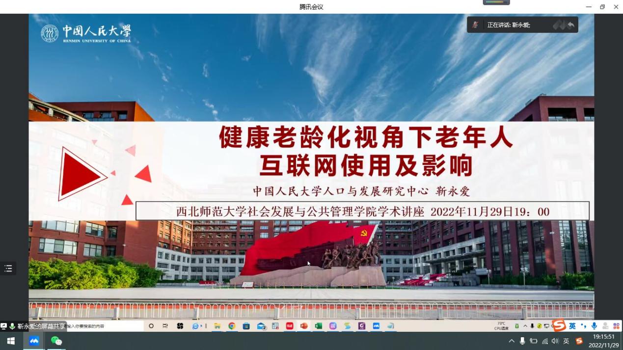 2022年11月29日19时,正值学校百廿校庆暨学院建院十周年院庆举行学术论坛系列学术讲座活动之际,应学院邀请,中国人民大学公共管理学院靳永爱教授莅临云端,在线为a动漫 师生作了题为“健康老龄化视角下老年人互联网使用及影响”的学术讲座。本次讲座由王琪瑛老师主持,学院200多名师生参加了此次讲座。
