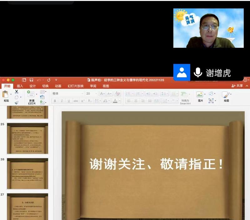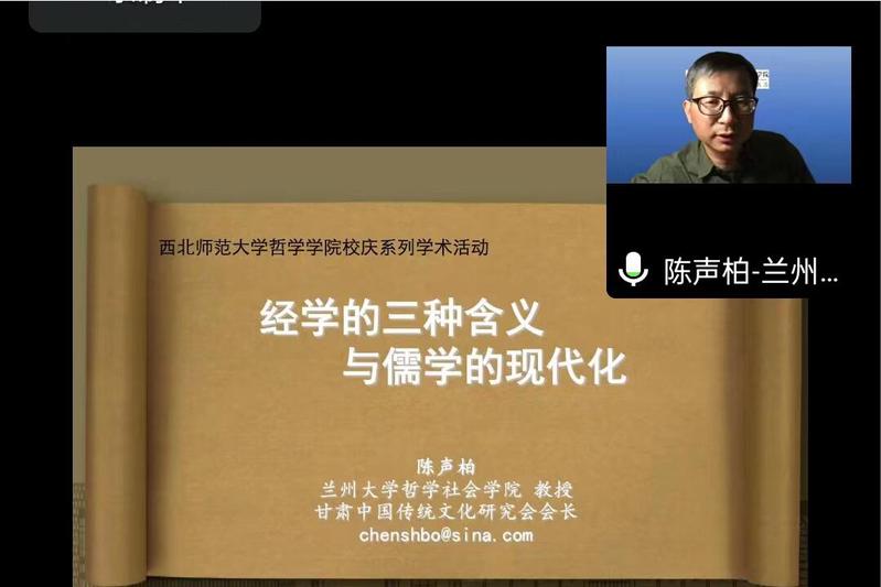 11月25日晚,兰州大学哲学社会学院院长陈声柏教授应邀在线上为a动漫 师生作了题为“经学的三种含义与儒学的现代化”的学术报告,谢增虎教授主持报告会。范鹏教授、张立恩副教授等校内外哲学爱好者百余人参加了此次报告。本场报告也是学校“百廿校庆学术活动”系列报告之一。