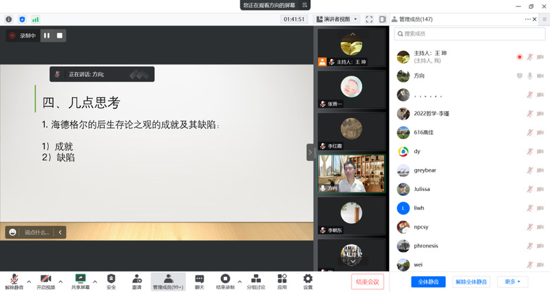 2022年11月17日晚,适逢第20个“世界哲学日”,由a动漫 哲学学院、中和集团、科学研究院、教师发展中心联合主办的“中和论道”第90期在线上如期举行。本期讲座主题为“观物——与海德格尔和邵雍一道思物之物性”,讲座邀请中山大学哲学系方向红教授作为主讲嘉宾,哲学学院朱海斌副教授作为与谈嘉宾,讲座由哲学学院王珅副教授主持,李朝东教授、孙玥博士、张海龙博士以及校内外的众多哲学爱好者等150余人参加了此次讲座。该讲座也是学校“百廿校庆学术活动”博雅讲堂系列报告之一。