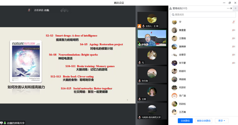赵鑫教授在讲座开始以《猩球崛起》这部电影向我们展示了认知能力改变的巨大影响及其重要性,从影片对于猩猩通过药物作用提升认知能力水平的科幻角度联系到现实层面人自身,进而提出“人类的智力能否得到提升”的问题。接着赵老师介绍了Nature中对“如何改善认知和提高脑力”的研究,列举了六种提高脑力的方式:药物、对老化的修复、神经电激活、大脑训练、饮食、社交。其中,大脑训练是我们本次讲座讨论的主要内容。关于大脑训练能否改善认知能力的问题,赵老师从实验心理学的视角,做了五个实验研究,并在本次讲座中为我们介绍了五个实验的具体过程及实验成果。在第一个实验中,选取了9-11岁的儿童共33名,进行了为期15天的动物活动记忆任务以及卡通人物方位活动记忆任务,实验结果表明,经过训练的儿童记忆能力明显得到提升。第二个实验选取了39名儿童和46名大学生进行了关于自控力的Go-Nogo任务,结果进行训练的儿童抑制能力效果好且保留的时间久,且迁移能力也得到提升,而成年的大学生保持效果较差。第三个实验选取了41名儿童和47名大学生进行了关于抗干扰能力的Stroop任务,结果是儿童的效果迁移好于大学生。第四个实验选取了高成就动机组和低成就动机组各25名进行了n-back任务,显然高成就组的结果优于低成就组。第五个实验选取了81名儿童进行了关于前瞻记忆的模拟星期实验,实验结果发现,前瞻记忆可以通过训练得到提高和改善。