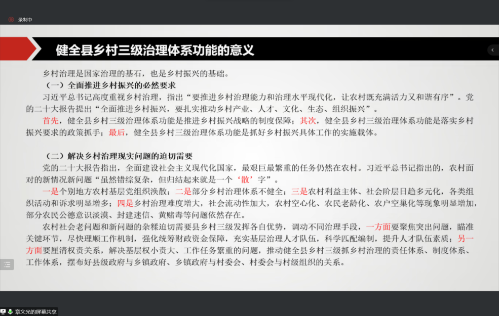 首先,章老师从实地调研、书面调研和资料学习三个方面简要介绍了本次讲座主题是在国家乡村振兴局政策法规司的直接领导下,围绕“健全县乡村三级治理体系功能”所展开的广泛而深入的调研。随后,章老师从全面推进乡村振兴的必然要求、解决乡村治理现实问题的迫切需要、推进县域内城乡融合的重要载体和实现乡村治理体系和治理能力现代化的关键抓手等四个方面介绍了健全县乡村三级治理体系功能的意义。接着章老师以时间为脉络从1921年至1949年的开创根据地乡村治理、1949年至1978年探索建立新中国的乡村治理、1978年至2012年的改革与完善乡村治理制度、2012年至今的开启乡村治理新时代四个阶段梳理了县乡村三级治理体系的形成演变。在县乡村三级治理体系功能的定位中,章老师从县乡村三级分别进行定位。他认为,县级功能定位为“领导指挥、统筹规划、协调推进”;乡镇功能定位为“综合治理、贯彻执行、服务指导”;村级功能定位为“三治融合、联农带农、政策落地”。
