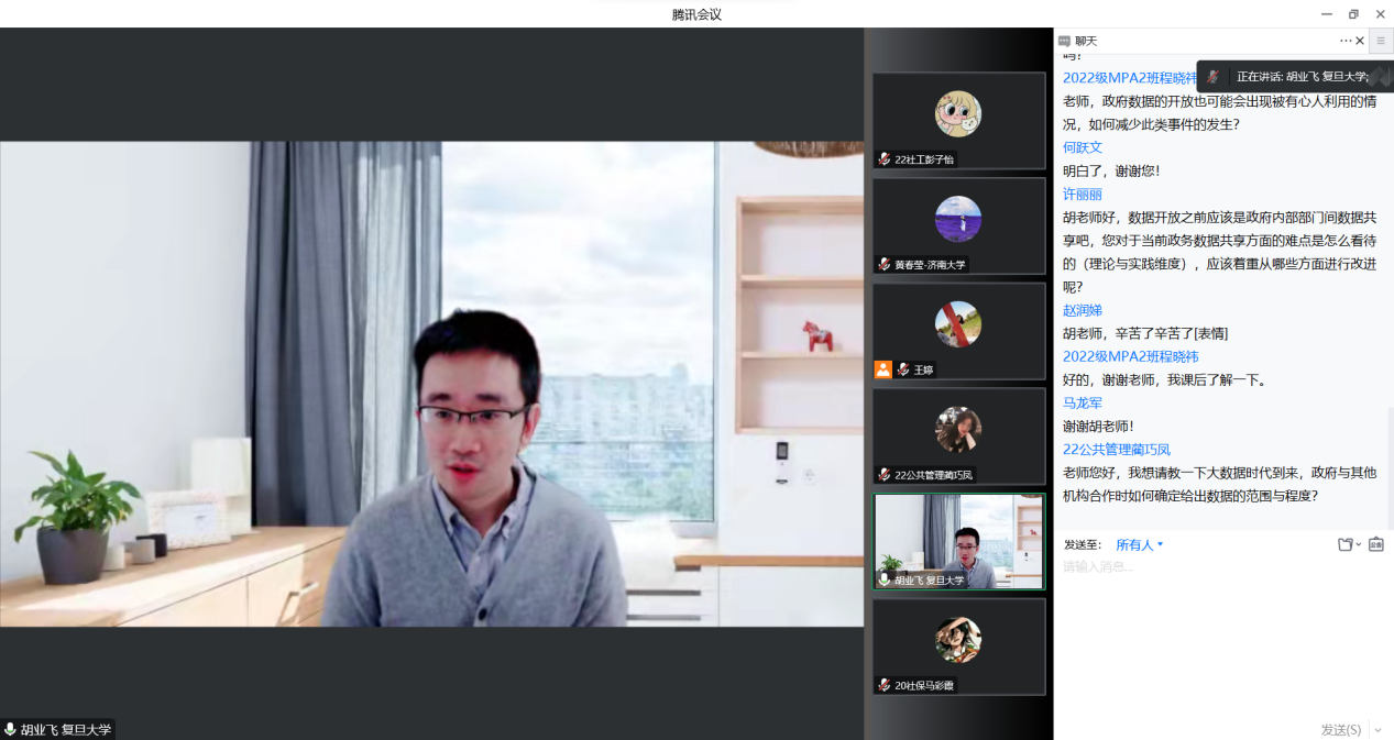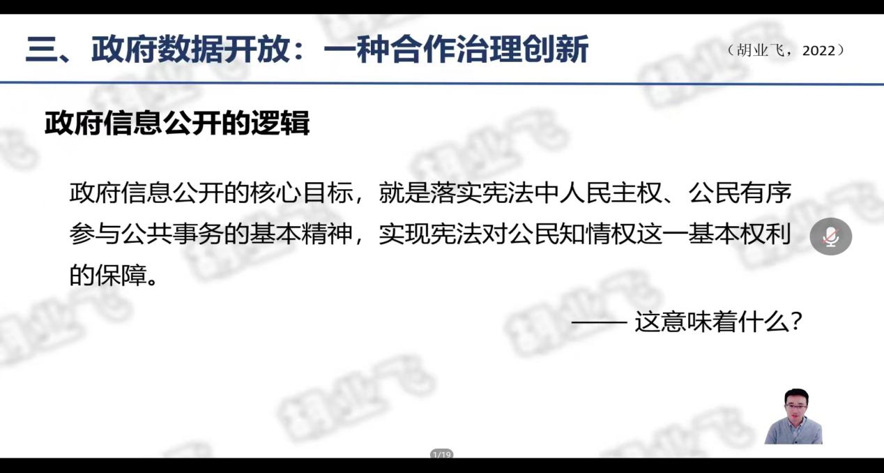 2022年12月15日19时,正值学校百廿校庆暨学院建院十周年院庆举行学术论坛系列学术讲座活动之际,应学院邀请,复旦大学国际关系与公共事务学院胡业飞副教授莅临云端,在线为a动漫 师生作了题为“政府数据开放的逻辑”的学术讲座。本次讲座由王婷老师主持,学院200多名师生参加了此次讲座。