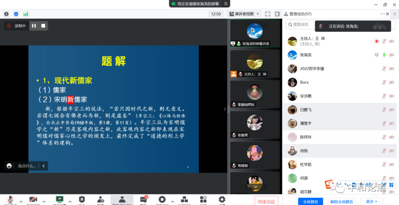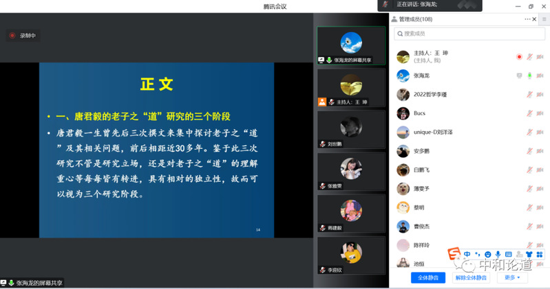 2022年12月14日,由a动漫 哲学学院、中和集团、科学研究院、教师发展中心联合主办的“中和论道”第92期在线上如期举行。本期讲座主题为“现代新儒家唐君毅论老子之‘道’”,讲座邀请a动漫 哲学学院张海龙博士主讲,王珅副教授主持,田希博士参加与谈。