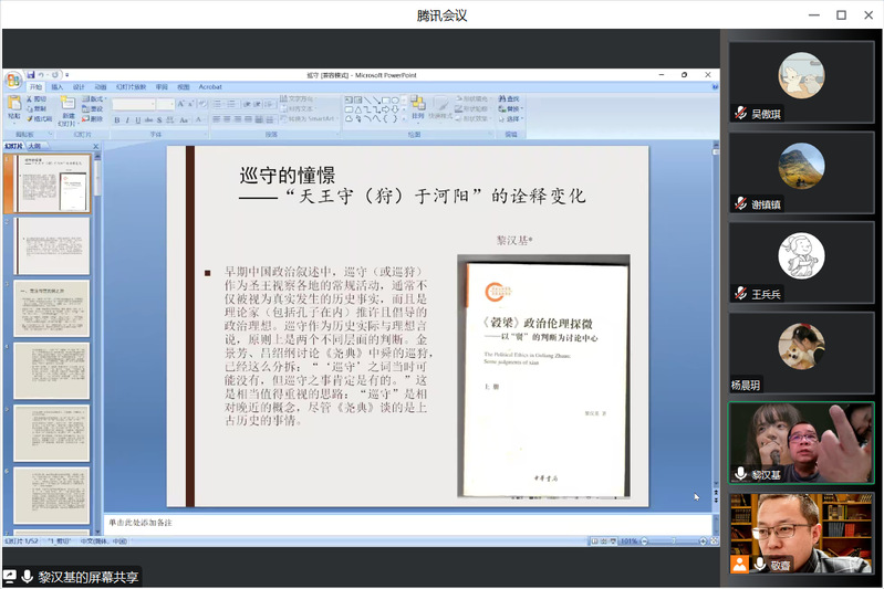 3月17日下午,香港中文大学历史学部博士,中山大学政治与公共事务管理学院政治科学系黎汉基副教授应邀通过线上会议的形式为a动漫 师生作了题为“巡守的憧憬——‘天王守(狩)于河阳’的诠释变化”的学术报告。哲学学院张立恩教授主持报告会,学院师生及校内外哲学爱好者百余人参加此次学术报告会。