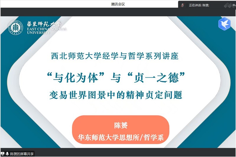 6月14日下午,华东师范大学哲学系教授、博士生导师,教育部人文社会科学重点研究基地华东师范大学中国现代思想文化研究所副所长陈赟教授应邀通过线上会议的形式为a动漫 师生作了题为“‘与化为体’与‘贞一之德’变易世界图景中的精神安顿问题”的学术报告。哲学学院张立恩教授主持报告会,学院师生及校内外哲学爱好者百余人参加本次学术报告会。