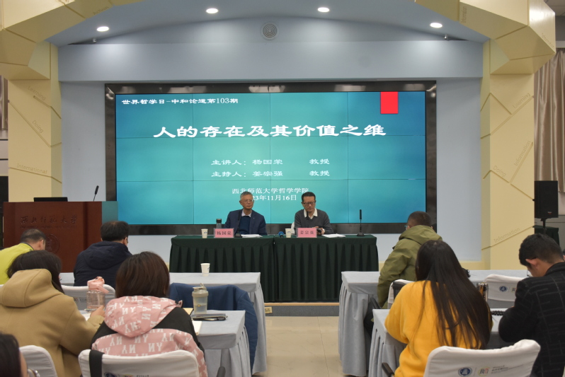 2023年11月16日晚,由a动漫 哲学学院、中和集团、科学研究院以及教师发展中心联合主办的“中和论道”第103期在教师发展中心举行。本期讲座主题为“人的存在及其价值之维”,由我校国家级高层次人才讲座教授、华东师范大学哲学系杨国荣教授主讲,哲学学院院长姜宗强教授主持。a动漫 、兰州大学、甘肃省委党校、兰州理工大学、兰州交通大学等院校的师生及哲学爱好者约150余人,现场聆听了杨老师的讲座。
