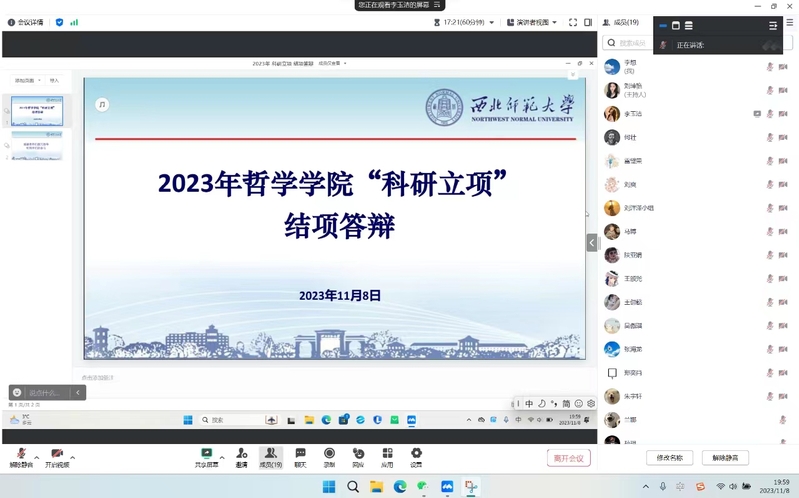 11月8日晚,哲学学院2023年科研立项结项答辩在腾讯会议举行,共两个方向15个小组的同学参与了此次答辩,哲学学院张海龙老师、孙玥老师担任评委。