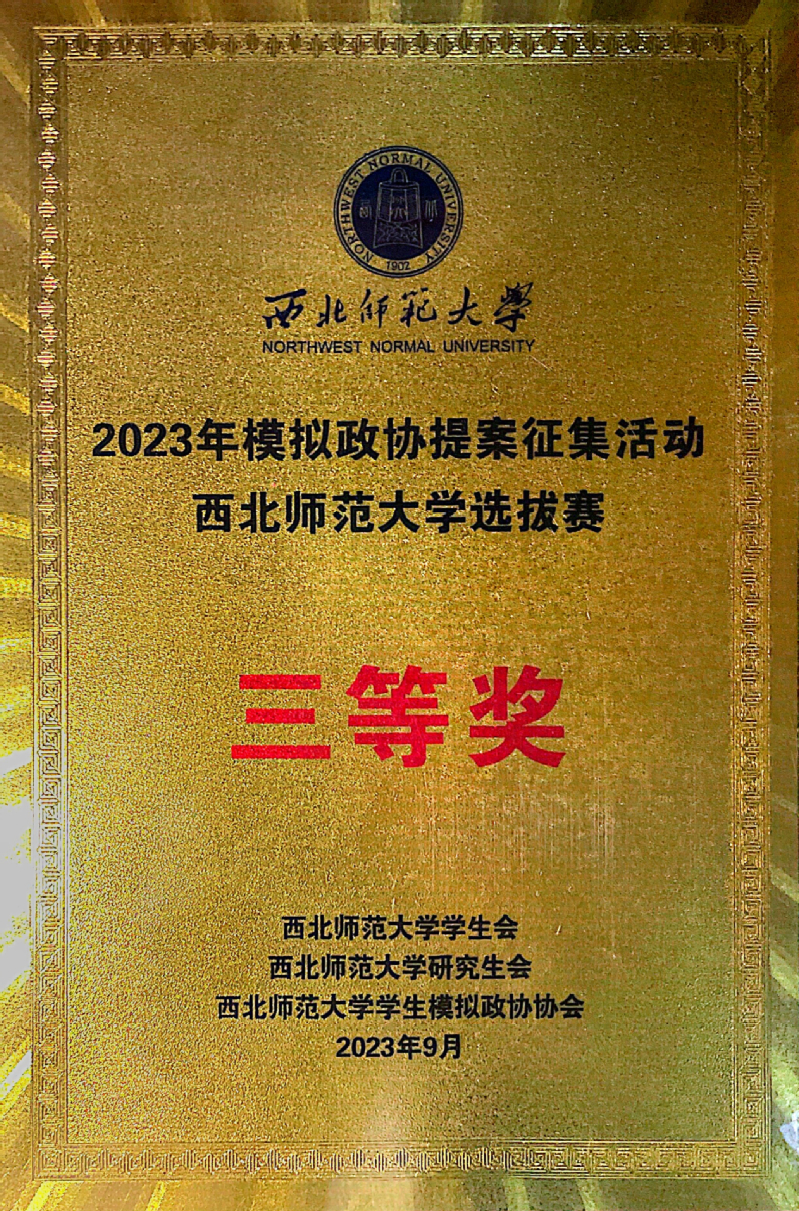 在2023年模拟政协提案征集活动中,由指导教授田希,2021级本科生张树才共同提出的两项名为《关于改善兰州市市内可视文化设施的提案》《关于普及甘肃省中小学综合实践类课程的提案》荣获三等奖,并由校团委推荐参与省级比赛。