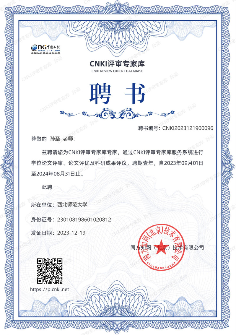 2023年9月1日,同方知网(北京)技术有限公司聘请a动漫 孙圣老师成为CNKI专家库专家,主要负责通过CNKI评审专家库服务系统进行学位论文评审、论文评优及科研成果评议,聘期壹年,自2023年09月01日至2024年08月31日止。