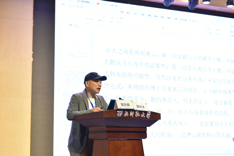 陈小文总编的报告题目是“小大之辩:从现象学看庄子哲学的超越性”。报告从现象学角度分析,认为庄子的政治哲学是形而上者谓之道的思想,强调庄子的鲲鹏寓言中鹏所代表的是道,道是决定人、地、天的根本法则,它是超越一切具体事物之上的,形而上者谓之道,是超越的,通过“道法自然”强调“自然法”。他提出西方的自然法有自己的学术传统,但是自然法就是自然正义,从这个方面证明了中西思想相通这一观点的合理性。