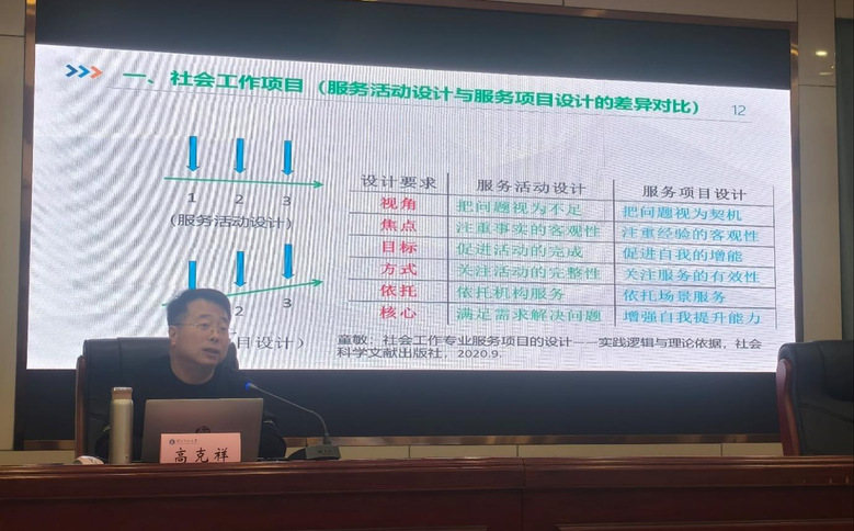 谢丽丽老师首先简要介绍了高克祥老师在社会工作相关领域的重要贡献以及研究成果,并对高老师的莅临表示热烈的欢迎。谢老师提到,社会工作专业的一门课程是《社会服务项目策划与评估》,高老师在项目方面有着丰富的社会服务项目申报经验,希望在项目策划、撰写和评估方面带给学生一些经验和方法。