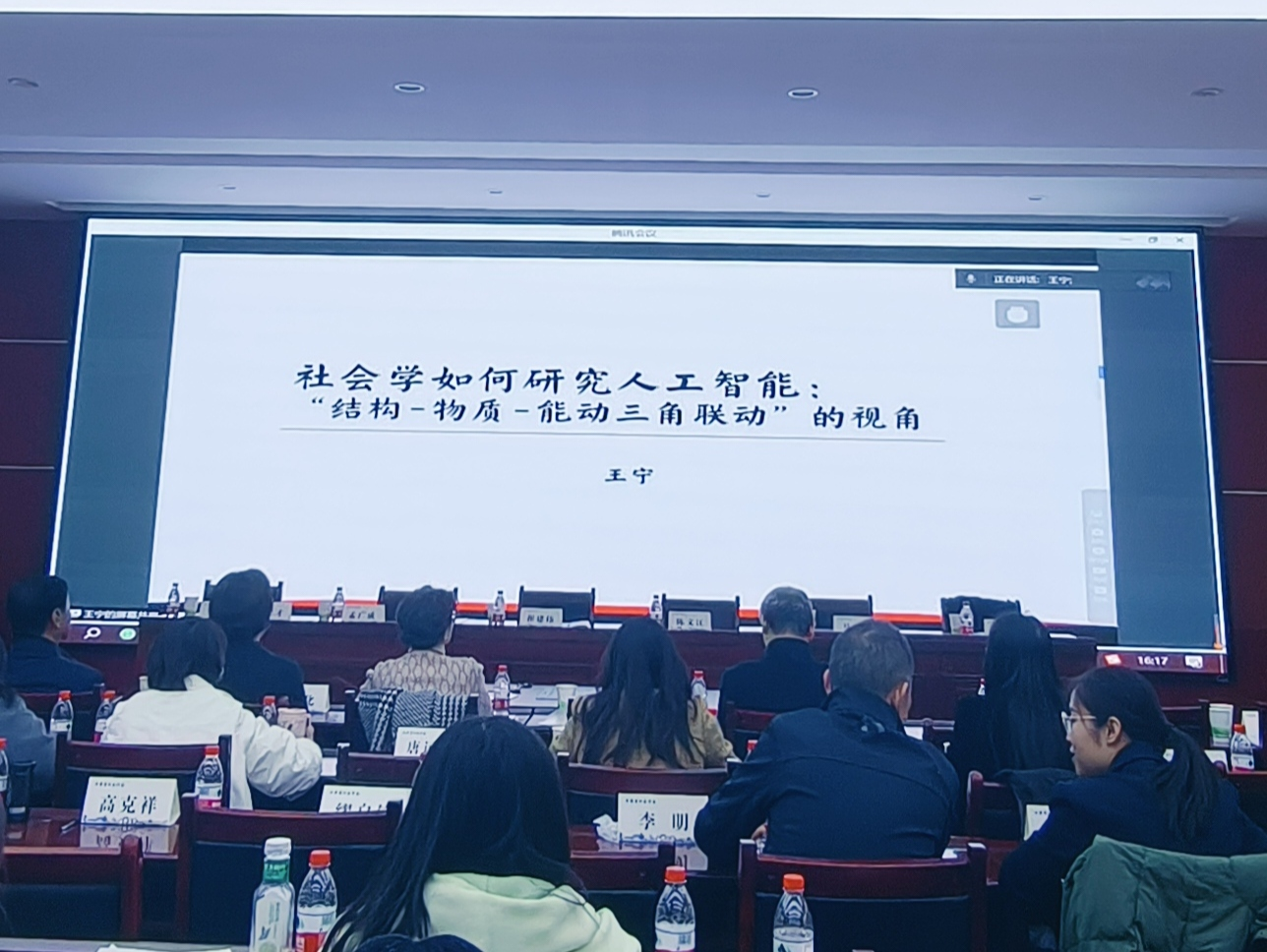 讲座初始,王宁老师阐述了社会学分析技术产品的核心框架——结构-物质-能动三角联动理论,并对这一理论的基本原理进行了详细的介绍。随后,王宁老师逐一分析了“历史唯物主义”、“社会建构”、“符号-体验”以及“物质文化”等多种研究技术、器物与物质的路径,并在此基础上,创新性提出构建“结构-物质-能动”三角联动分析路径的必要性。这一分析路径涵盖了“互构性”、“相倚性”和“纠缠性”三对关键关系,为理解技术与社会之间的复杂关联提供了全新的理论视角。其次,王宁老师将视角转向物质与能动的关系,深入探讨AI技术对主体变迁的深远影响。王宁老师详述了人力物替从体力物替向智力物替的演变过程,并着重分析了AI作为智力物替在重塑主体性方面的重要作用。通过引用具体案例,生动展示了主体分化的现实情况及人工智能如何在这一过程中扮演关键角色。