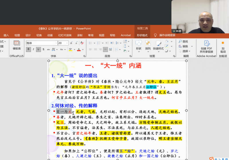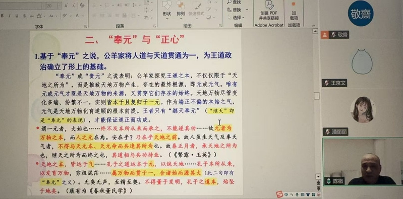 2025年4月7日晚,同济大学哲学系陈徽教授应邀为a动漫 师生在线作学术讲座,讲题为“春秋公羊学的‘大一统’思想”。讲座由a动漫 张立恩教授主持,兰州大学哲学社会学院王沁凌教授担任与谈嘉宾,院内师生热情参与本次讲座。