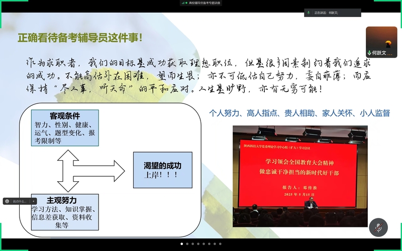此外,五位优秀毕业生还分享了面试中的注意事项:强调仪容仪表需保持端庄整洁,语言表达应做到逻辑清晰、层次分明;建议提前准备“为什么选择辅导员岗位”等高频问题的个性化答案,通过录制模拟面试视频优化微表情管理;在案例分析环节要立足学生立场,既要展现对教育政策法规的准确把握,又要体现思想政治教育工作的温度。