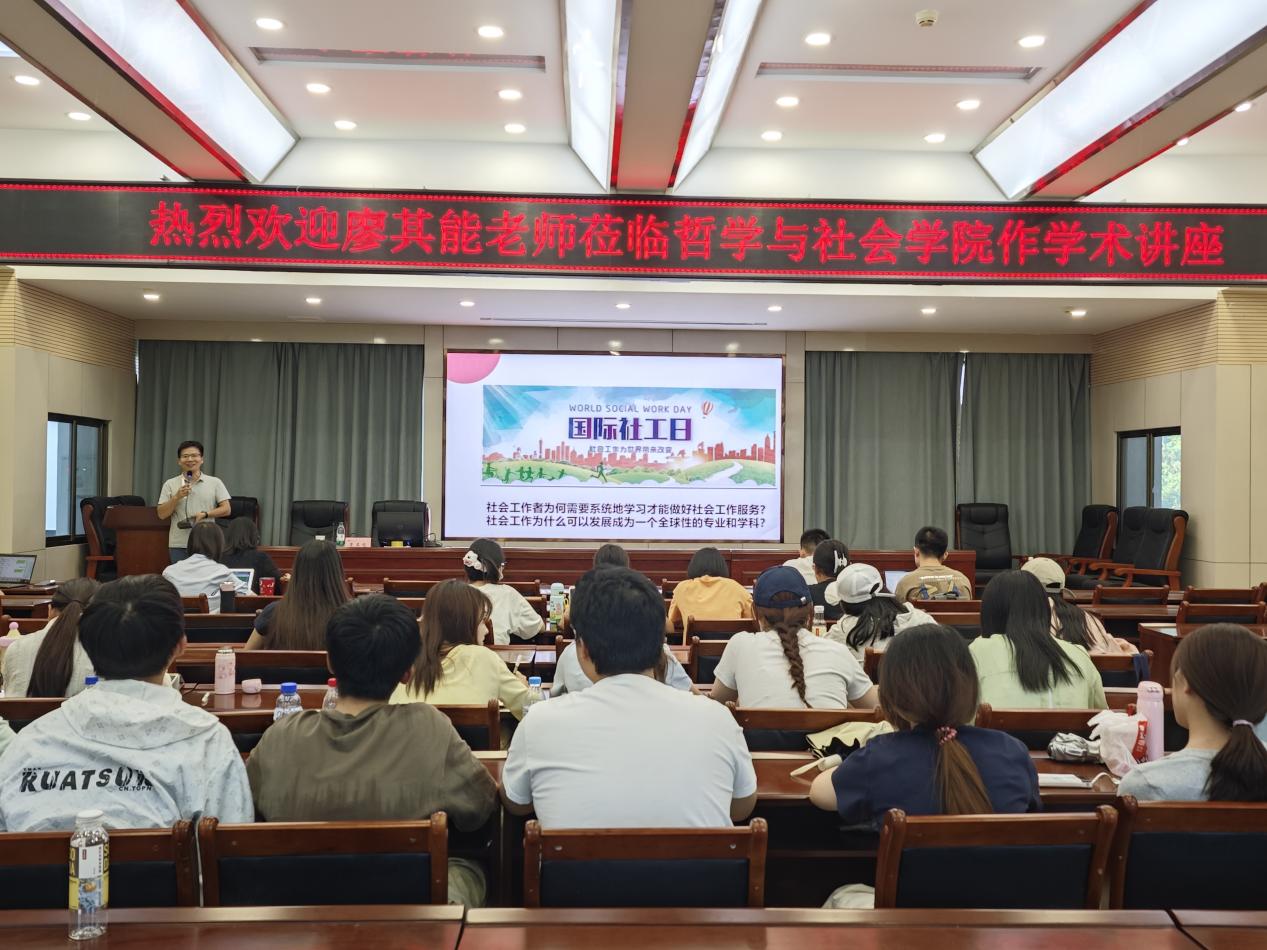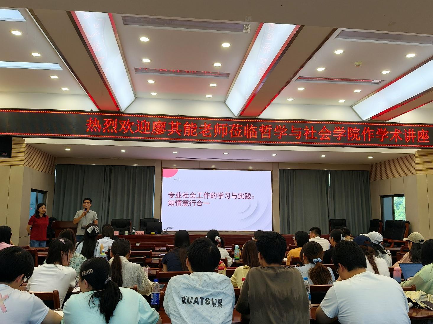 2025年6月11日19:00,中山大学廖其能博士应邀在a动漫 10号教学楼D区四楼报告厅为a动漫 师生带来了题为《专业社会工作的学习与实践:知情意行合一》的学术讲座。本次讲座由徐菲老师主持,社会学与社会工作专业全体学生参加并听取了此次讲座。