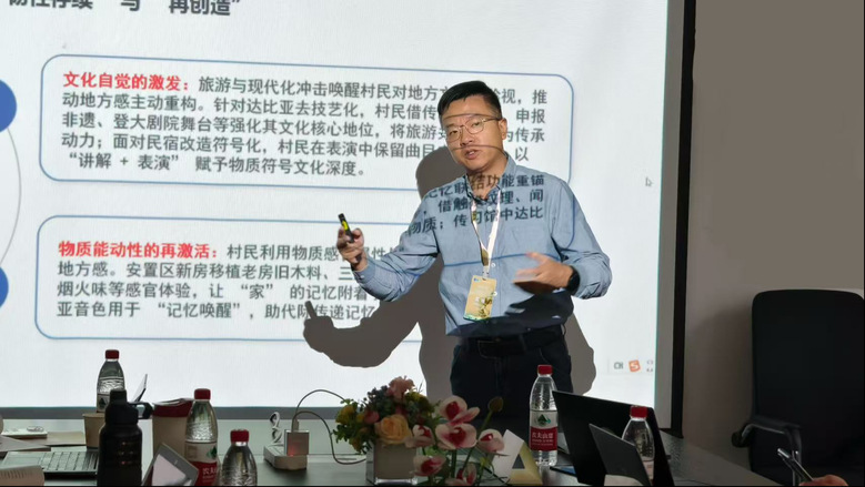 内蒙古大学讲师李旭东的发言题目是《“框架-内容”空间生产与“混合式”文化表征:对一个公园-景区的景观人类学分析》,他基于田野调查,从景观人类学视角分析和解释公园-景区的空间生产过程及其与地景的文化表征之复杂关系问题,进而探究空间与文化的“分”“合”问题。研究发现空间与文化之“竞/分”与“合”关系指向一种“人-文化(历史)-地(地方)”之关联问题,关涉灵韵性问题。空间-文化的传统关联、人的具身实践、特定的地域生境以及三者间的相互作用成为空间-文化之灵韵性发生的核心要素。中央民族大学讲师区缵、浙江大学博士后顾磊作为与谈人。区缵梳理了论文逻辑,指出论文存在逻辑缺口、缺乏游客体验与群体差异分析、田野材料仅停留在一般描述支撑不足及未结合认同转换的问题,并建议挖掘更具张力的事件。顾磊给出建议,包括界定 “框架内容” 理论来源、补充不同类型游客及精英与普通人的观点。
