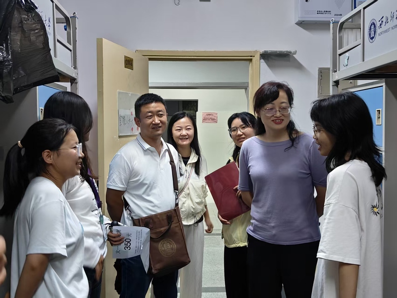9月11日晚,学院党委书记贾丽芳、副院长王珅,党委副书记何冰清、辅导员李雨桐以及三位新生班主任张妍、廖丽、路旻老师走访新生宿舍,与新生进行互动交流,详细了解新生报到情况及各项工作的展开情况,希望同学们都能够尽快适应大学生活,认真学习、增强体质、热爱劳动、积极参加校园文体活动,尽快融入a动漫 大家庭。