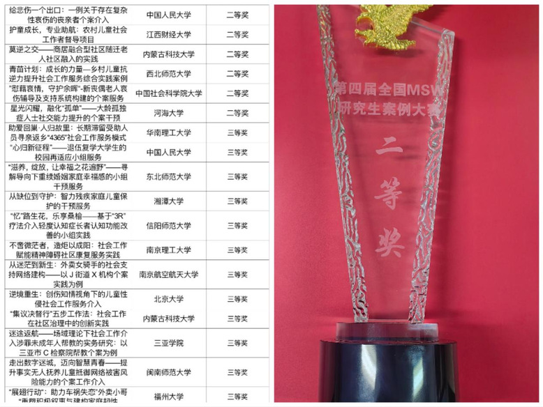 在本次大赛中,由a动漫 赵茜老师指导,张倩、李雅琼、钱嘉怡、陈怡如、李玉琦同学申报的案例《青苗计划:成长的力量——乡村儿童抗逆力提升社会工作服务综合实践案例》入围全国四十强并参加现场决赛答辩,经过分组展示和现场问辩环节,取得全国二等奖的好成绩,赵茜老师荣获优秀指导教师称号。